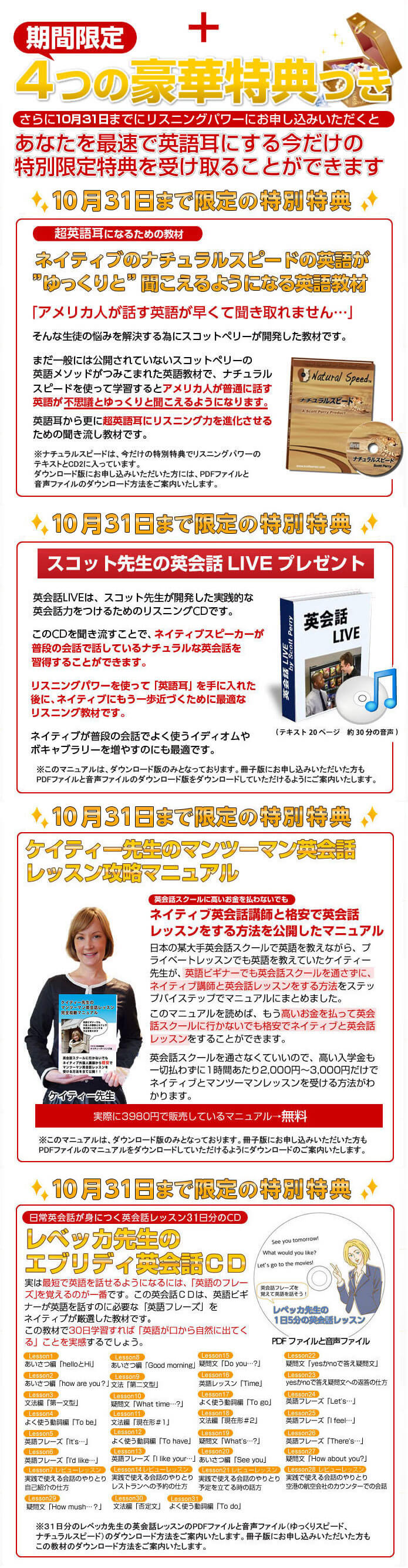 ですが、スコット先生は、やはり一人でも多くの日本人にバイリンガルになって欲しいという気持ちで、特別に今だけ14,800円という特別価格でリスニングパワーを提供することにしました。